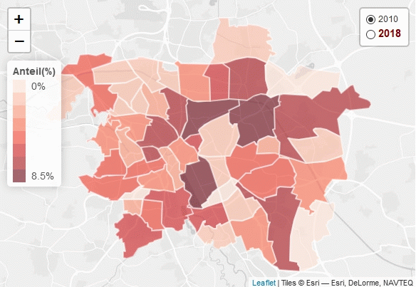 Die Karte zeigt für die Stadtteile Hannovers die Häufigkeitsverteilung in den Jahren 2010 und 2018.
