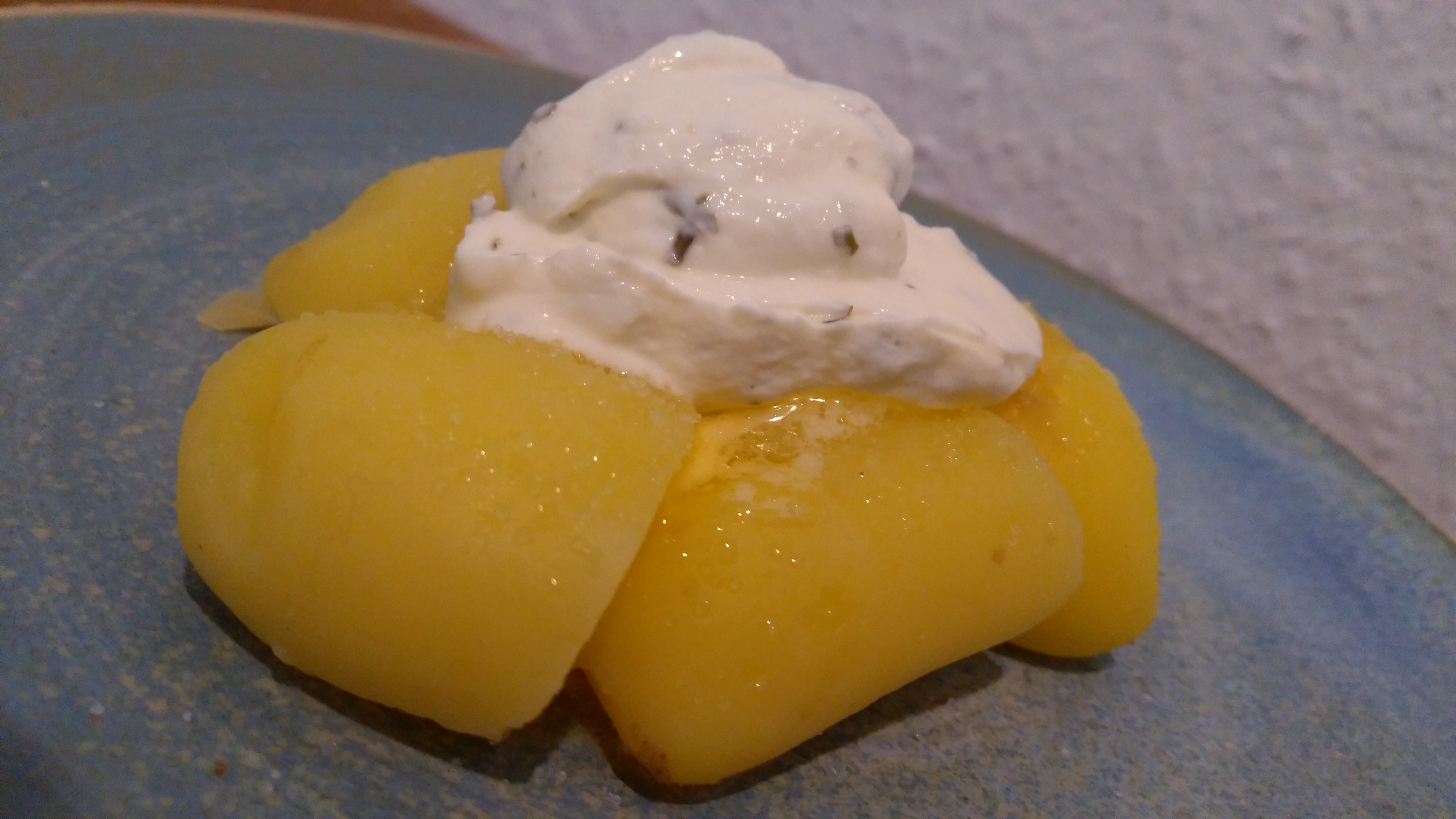 Kartoffeln mit Kümmel in reichich Salzwasser kochen. Wenn diese fertig sind, kann man sie pellen und mit Butter, Salz und selbstgemachten Kräuterqurk servieren.