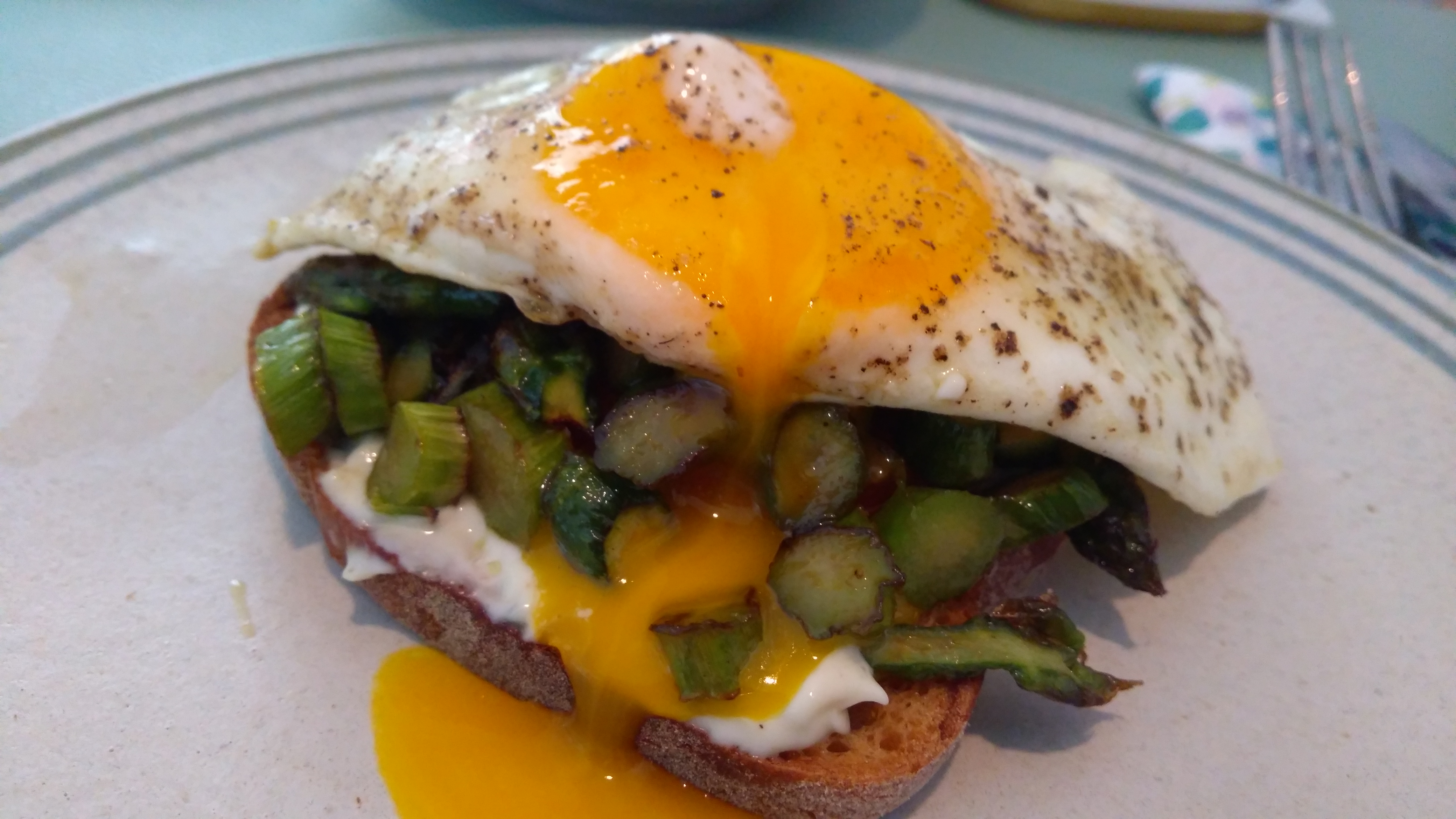 Brot toasten. Spiegeleier kochen und Frühlingszwiebeln kleinschneiden. Die Toasts mit Mayo bestreichen und mit Salz und Pfeffer würzen. Mit Eiern, Zwiebeln und Lachs belegen.